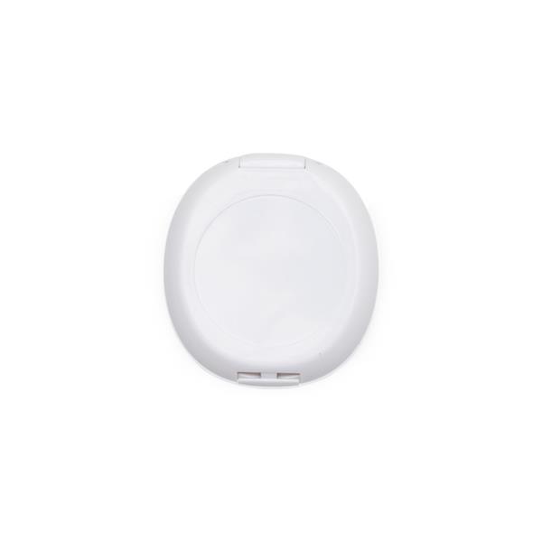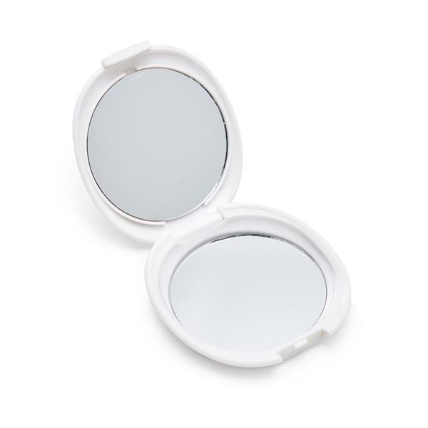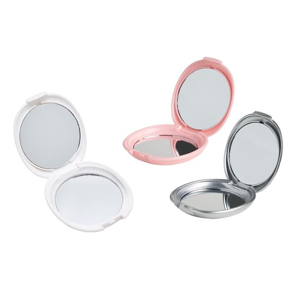 Espelho duplo sem aumento, material plástico. Altura: 7 cm / Largura: 6,4 cm / Circunferência: 7,3 cm / Espessura: 1,5 cm