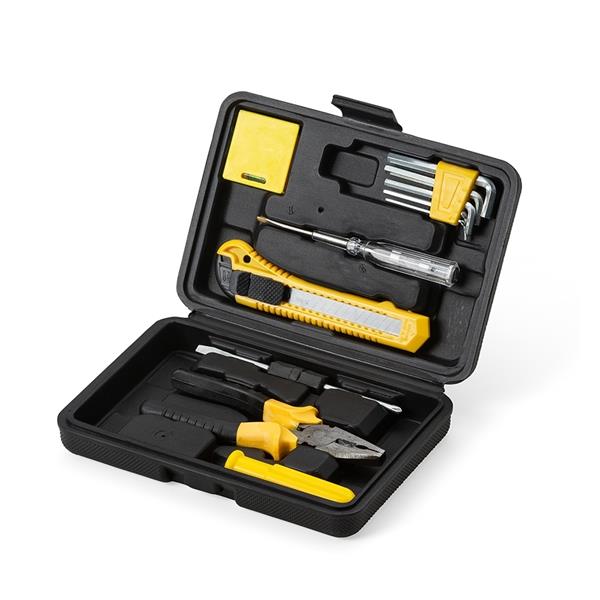 Kit Ferramenta 11 Peças em EstojoReferência FERRA-151Quantidade mínima 50 ResumoKit ferramenta 11 peças em estojo plástico. Maleta plástica com detalhe retangular no centro frontal e verso com o detalhe na lateral inferior, possui texturização no estojo e uma trava superior. Acompanha: conjunto de 5 chaves Allen, trena de 1 metro, chave teste, estilete, chave dupla(Phillips e Fenda), alicate e cabo plástico para encaixe da chave dupla. FERRA-151Quantidade 1 Selecione 50 Informe outra quantidade min. 50 Incluir item no orçamento Voltar