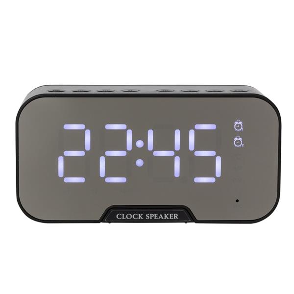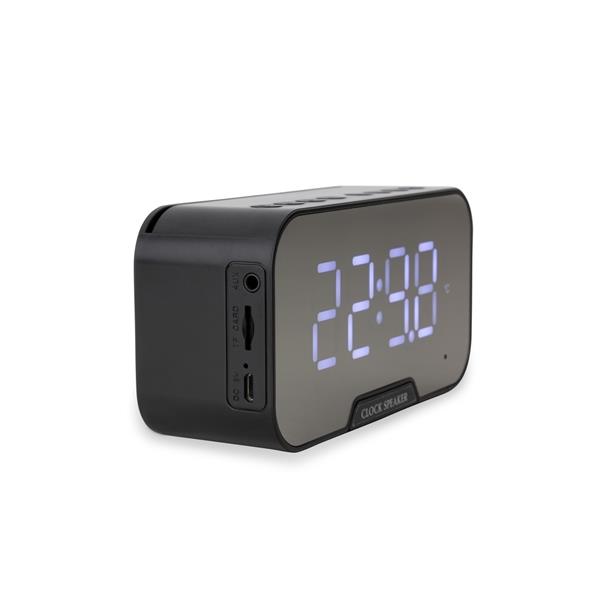 Caixa de som multimídia com relógio despertador e suporte para celular. Produzida em plástico e com borrachas antiderrapantes na área inferior, a caixa de som tem a área frontal espelhada e display de LED, além de um compartimento com suporte para celular – uma espécie de “gaveta” aonde é exibido (CLOCK SPEAKER), basta puxá-la ter acesso ao compartimento. A caixa de som executa nos modos bluetooth, rádio FM, cartão TF-microSD (até 16GB) e entrada auxiliar P2, para alternar entre os modos basta pressionar o botão M (modo); ao segurar o botão ON ? o produto será ligado/desligado, ao pressioná-lo irá iniciar/pausar a faixa; os botões l?? e ??l ao serem pressionados irão retroceder ou avançar as faixas, ao serem segurados irão diminuir ou aumentar o volume; o botão ?alterna a luminosidade do display entre 3 níveis; os botões ao serem pressionador durante o modo de configuração, irão ajustar o relógio, despertador e toque do alarme; o botão SET ao ser pressionado irá alterar entre 4 opções: relógio, ativação alarme 1 (será exibido o símbolo do despertador 1), ativação alarme 2 (será exibido o símbolo do despertador 2) e ativação alarmes 1 e 2 (serão exibidos os símbolo dos despertadores 1 e 2), para cada modo escolhido, segure o botão SET para iniciar a configuração e depois o pressione para avançar ao próximo ajuste – no modo despertador é possível escolher entre 5 alarmes para reprodução. Para usufruir adequadamente da função de rádio, é necessário conectar o cabo microUSB para que este sirva como uma antena receptora de sinal, feito isso pressione o botão ON ? para iniciar a sintonização automática. Além destas funções, o relógio tem exibição de temperatura em graus Cº, display com exibição de volume, exibição de sintonia das rádios e função para atendimento de chamadas telefônicas (necessário estar conectado ao bluetooth). Bluetooth V 5.0; Frequência de resposta 80Hz-20KHz; Frequência de rádio 87.5MHz-108MHz; Bateria de lithium 3.7V com 1400mAh; Distância de alcance 10 metros; Voltagem DC 5V; Falante 4O3W; SNR =65db e distorção 0,5% . Acompanha cabo USB e manual em inglês.
