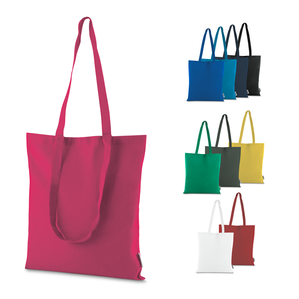 Bolsa confeccionada em algodão sólido reciclado, com gramatura de 140g/m², dimensões de 42 x 38 cm e alça de comprimento fixo medindo 33 cm.