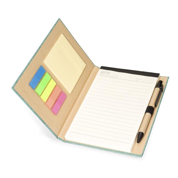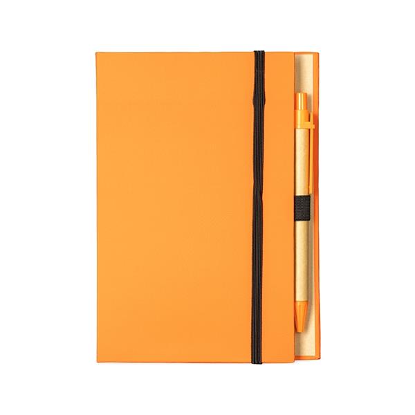 Bloco de Anotações com Autoadesivos e Caneta e PautaReferência BC-139Quantidade mínima 50 ResumoUm bloco de anotações com capa revestida em papel especial e fita elástica para fechamento. Contém aproximadamente 80 folhas amareladas destacáveis com pauta, além de um bloco com cerca de 20 folhas autoadesivas amarelas e aproximadamente 100 marcadores de página autoadesivos, divididos em cinco cores diferentes. Acompanha uma caneta esferográfica com carga azul de 1.0mm e acionamento por clique, corpo em papelão e demais componentes em plástico. Largura : 13 cm Espessura : 1,4 cm Comprimento : 18 cm Medidas aproximadas para gravação (CxL): 18 cm x 9,5 cm (capa) - 0,8 cm x 10 cm (caneta) Tamanho total aproximado (CxL): Caneta: 14 cm x 1 cm Peso aproximado (g): 187 Cor * Azul Branco Laranja Preto Verde Vermelho Quantidade 1 Selecione 50 Informe outra quantidade min. 50 Incluir item no orçamento Voltar