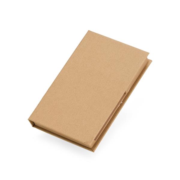 Bloco De Anotações Com Autoadesivos E Caneta EcológicoReferência BC-136Quantidade mínima 50 ResumoTudo em seu lugar, prontinho para as anotações! Nosso Bloco de Anotações Ecológico é perfeito para manter a organização enquanto se registra ideias. Feito de material kraft, ele vem com 100 folhas brancas para anotações, 5 marcadores autoadesivos coloridos para destacar o que é importante, 7 clips guardados em uma gavetinha prática e uma mini caneta de papelão com carga esferográfica azul. E ainda conta com espaço para armazenar a caneta e dois suportes porta-caneta, garantindo praticidade no dia a dia. Este bloco é tudo o que o seu cliente precisa para dias repletos de anotações. BC-136Quantidade 1 Selecione 50 Informe outra quantidade min. 50 Incluir item no orçamento Voltar