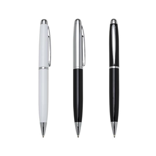 Caneta metálica com carga esferográfica azul e acionamento por rotação. Largura : 15 cm Comprimento : 13,6 cm Peso aproximado (g): 16 PERSONALIZADO