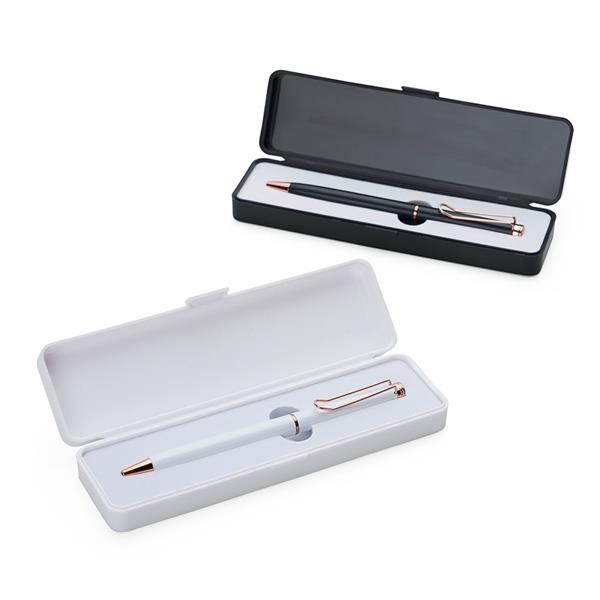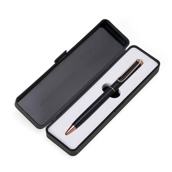 Conjunto caneta metálica com estojo de plástico e berço espumado. Carga esferográfica azul e acionamento por rotação. Altura : 16,8 cm Largura : 4,7 cm Espessura : 2 cm