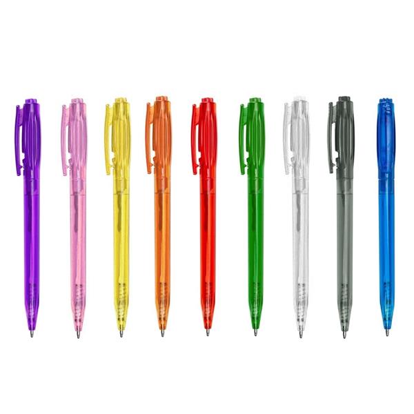 Caneta plástica translúcida com carga esferográfica azul e acionamento por clique. Medidas aproximadas para gravação (CxL): 6,4 cm x 0,7 cm Tamanho total aproximado (CxL): 13,6 cm x 1,6 cm Peso aproximado (g): 6 PERSONALIZADO.