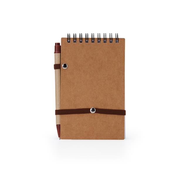 Bloco de anotações ecológico com caneta, feito em kraft com detalhe plástico. Contém aproximadamente 70 folhas brancas com pauta, porta caneta elástico, elástico para lacre e acompanha caneta de papelão com detalhes plásticos, carga esferográfica azul 1.0mm e acionamento por clique. Largura: 9 cm Espessura: 1,5 cm Comprimento: 14,9 cm