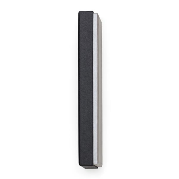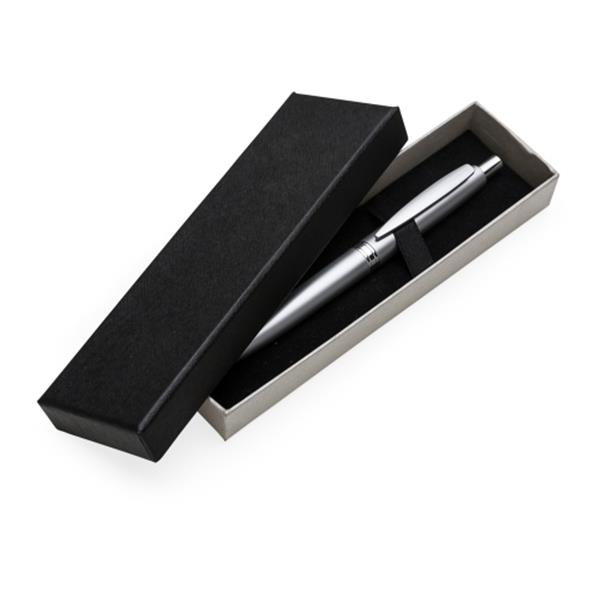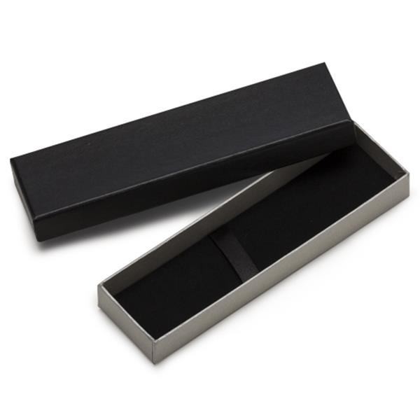 Estojo de papelão para uma caneta, tampa preta e “base” prata. Parte interna revestida com veludo e possui elástico para fixar a caneta.