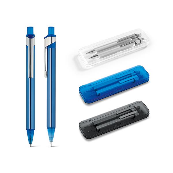 Conjunto de esferográfica e lapiseira. Alumínio. Esferográfica: 1,5km de escrita. Lapiseira: grafite 0.5. Incluso estojo. ø11 x 137 mm - Estojo: 165 x 50 x 24 mm PERSONALIZADO