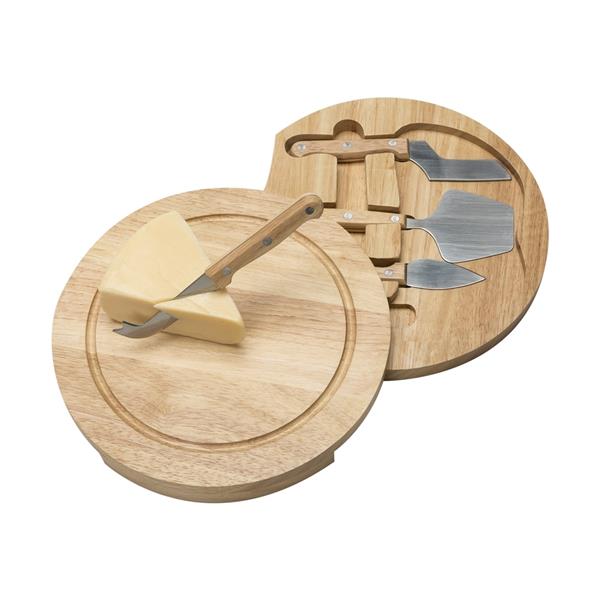 Kit queijo 5 peças, possui tábua de madeira com detalhe circular em relevo na parte superior e parte inferior com borrachas antideslizantes. Contém faca reta, espátula, faca com ponta e garfo em inox. Para abrir basta rotacionar a tampa.