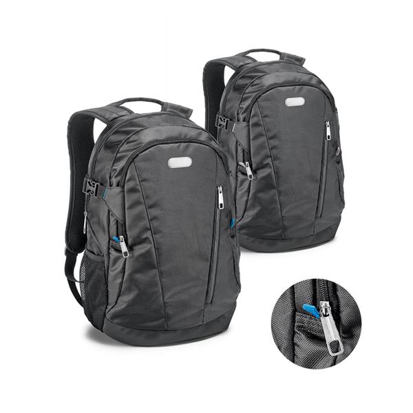Mochila para notebook em 840D jacquard com dois compartimentos forrados. O compartimento posterior tem divisória almofadada para notebook até 15.6'' e o compartimento frontal diversos bolsos interiores. Bolso lateral em tela e bolso frontal. Parte posterior almofadada, com sistema de apoio acolchoado para as costas e alças almofadadas. Placa metálica removível com imã, para fácil gravação. 305 x 470 x 180 mm - Placa: 50 x 20 mm