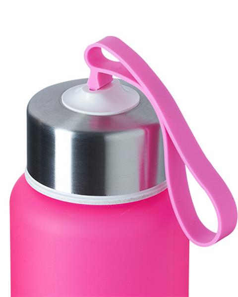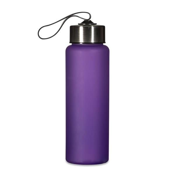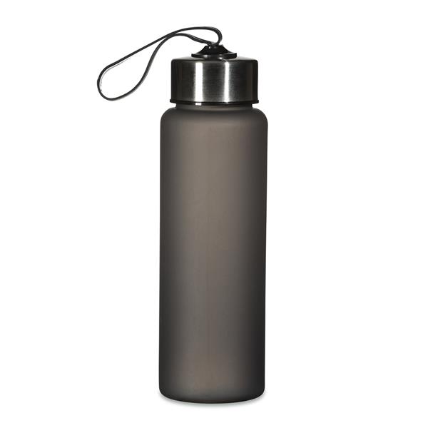 Squeeze plástico de 680ml. Produzido em PVC fosco livre de BPA, a squeeze possui tampa rosqueável em inox com alça elástica para transporte (não removível).